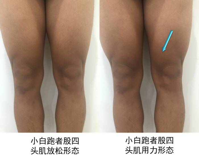 从下图中我们看到,初跑者、小白跑者的股四头肌内侧头明显不发达,不仅放松时看不出肌肉轮廓,用力时肌肉轮廓也很不清晰。