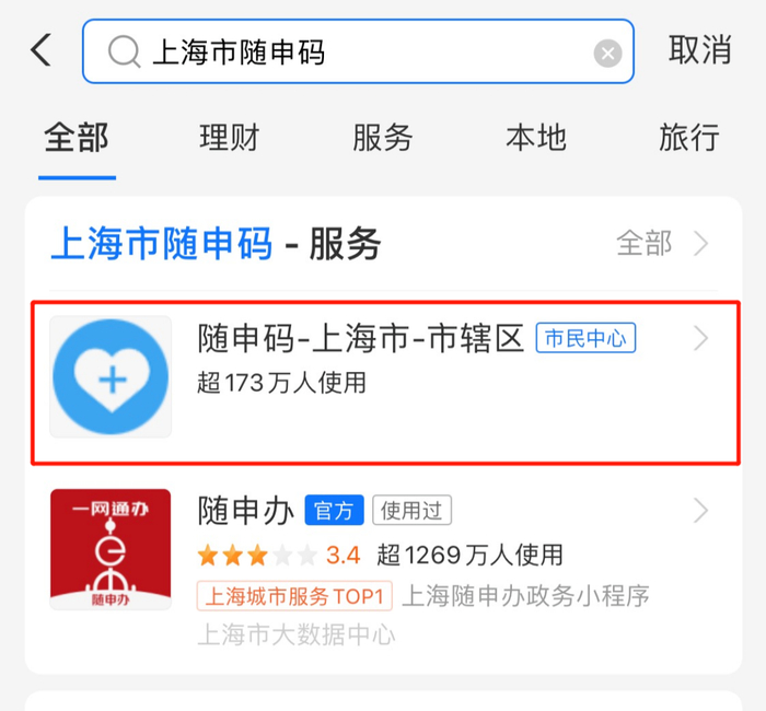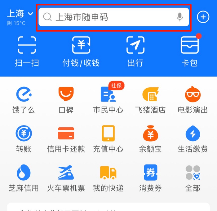 1、打开支付宝,搜索框内输入“上海随申码”;