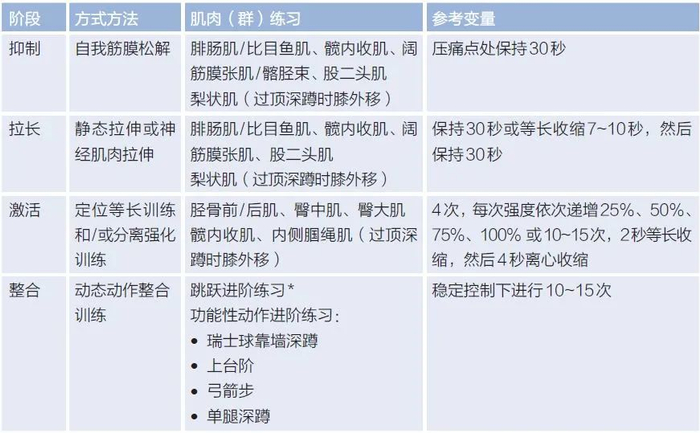下面分享一个来自美国国家运动医学学会(NASM)的纠正性训练方案,来帮助大家解决这个问题。训练方案分以下4个阶段进行:抑制阶段、激活阶段、拉长阶段、整合阶段。