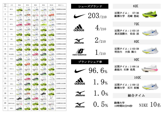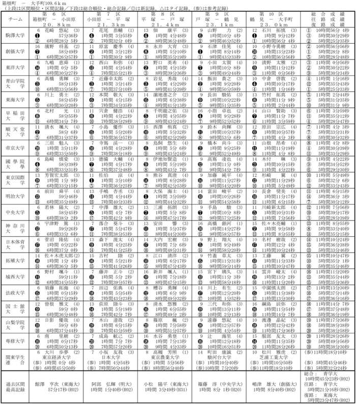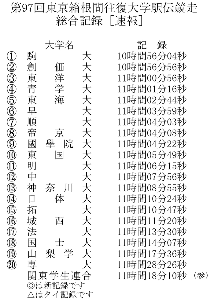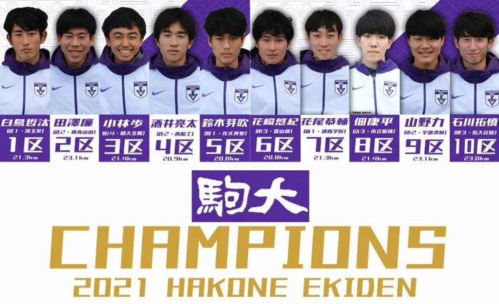 最终冠军是驹泽大学队,他们的最后一棒石川拓慎太神勇——在落后很多的情况下,实现惊天大逆转,率先撞线,捧得总冠军(10小时56分04秒)。他这一棒用时1小时09分12秒,为本区段最快。