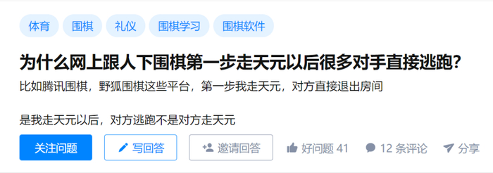 前两天,小编在网上冲浪的时候看到有人问:为什么网上跟人下围棋,第一步走天元以后,很多对手就直接逃跑了?