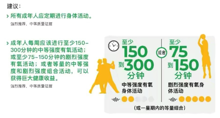 世界卫生组织公布的最新《身体活动和久坐行为指南》,其中建议成年人每周至少进行150-300分钟的中等强度有氧运动;或75-150分钟的较高强度有氧运动,可以获得巨大健康收益。