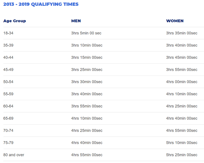 例如,要想参加波士顿马拉松,除非你有钱,那么要参加的话需要达到一个标准,这个标准就是BQ,每个年龄段都有不同的成绩标准。