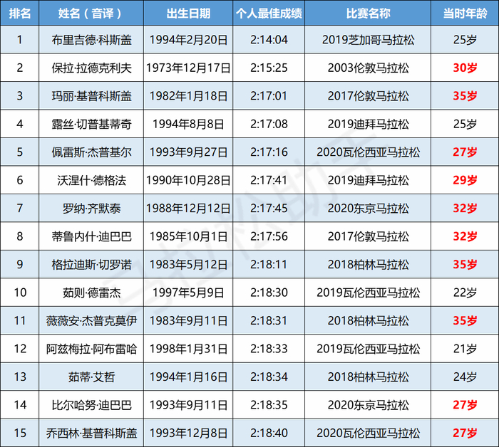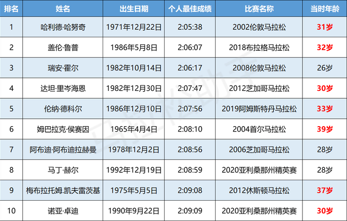 来看看目前男子马拉松史上10大高手,大多在30-35岁还能进入巅峰状态,创造个人最佳战绩。