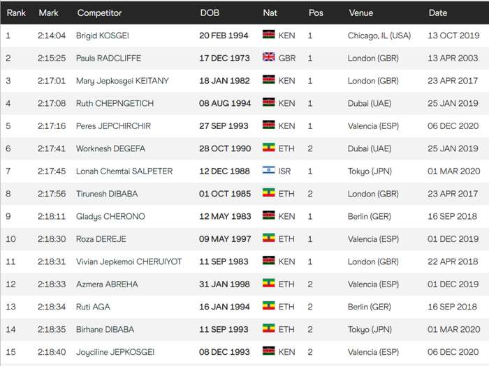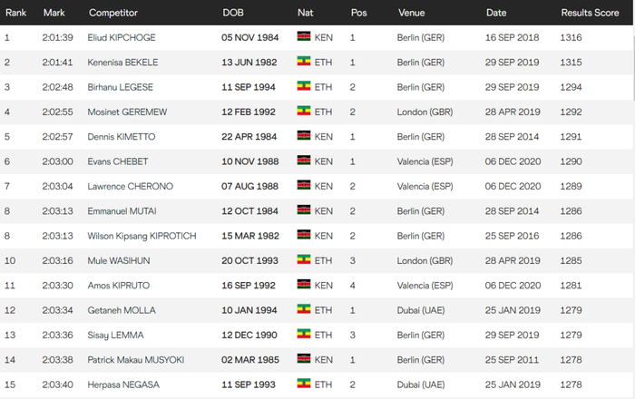这是世界田径网站,男子马拉松前15排名:
