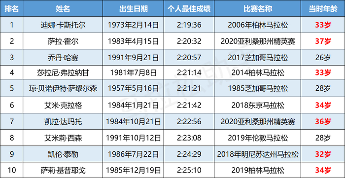除了男子选手外,顶尖女子马拉松选手也存在这样一种“高龄”现象: