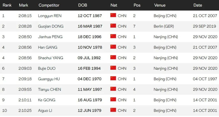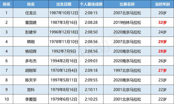 中国男子历史前10中,仅有董国建一人在30岁以上,不愧是“中国马拉松常青树”!