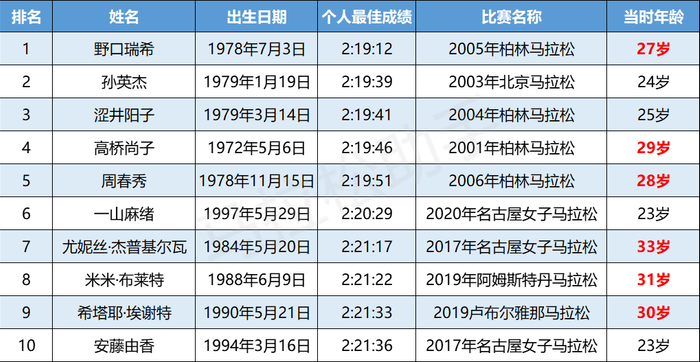 可见在马拉松史上10大男女高手中,男子高手多为30至35岁,女子高手则密集分布于27至35岁之间。