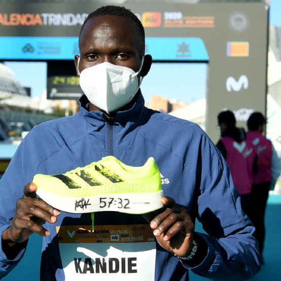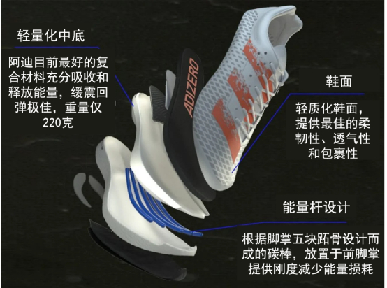 奋起直追的阿迪达斯adizero adios Pro也是采用类似技术。这双跑鞋今年也取得不俗战绩,基比沃特·坎迪在瓦伦西亚半马比赛着阿迪这双鞋打破了卡姆沃罗创下的58:01的世界纪录,其最终成绩为57:32,提高幅度高达半分钟。