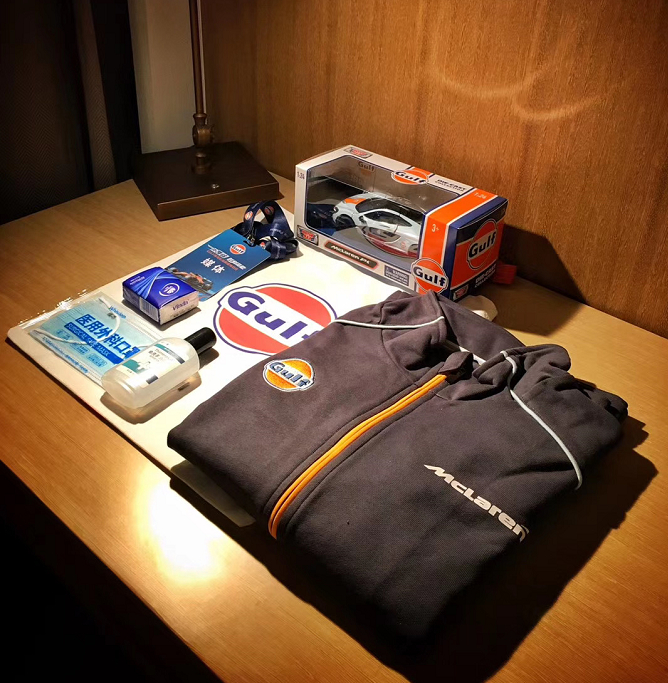 本次活动的策划非常有心思,入住酒店后打开礼品袋,竟然有一台GULF海湾涂装的迈凯伦P1合金模型,和一件穿起来像车队高级工程师的GULF & McLaren联名外套,而在当前疫情下,还贴心准备了免洗酒精和独立口罩。