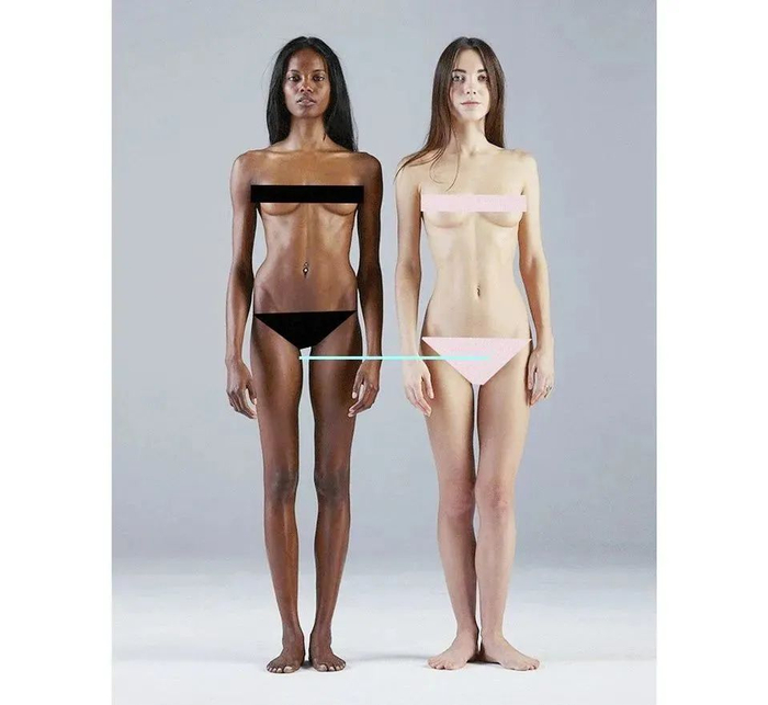 黑人妹子腿长,上身较短,手腕线轻易低过裆部;而白人妹子,因为腿短上身长,手腕线明显高于裆部;