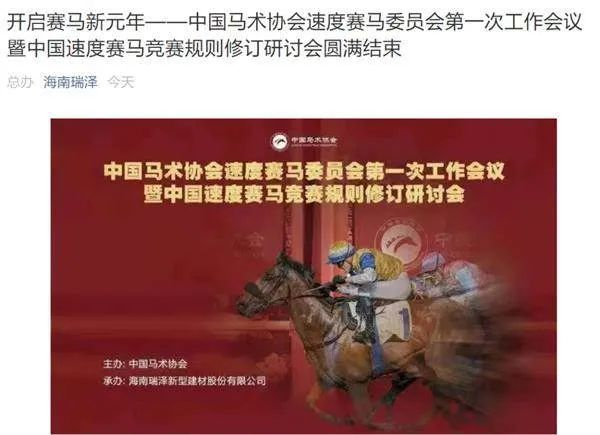 该文章称,本次会议由中国马术协会主办,海南瑞泽新型建材股份有限公司承办。中国速度赛马竞赛规则修订研讨会在海南瑞泽集团会议室召开。会议对中国速度赛马规则进行了充分的讨论和修改,将于2021年试行。中国速度赛马技术标准和中国速度赛马竞赛规则将同时颁布。