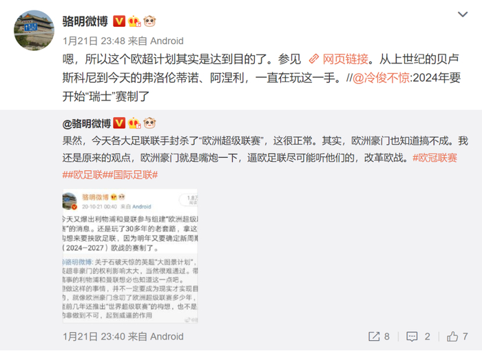 在金球奖中国唯一评委、体坛加总编辑骆明看来,从上世纪的AC米兰老板贝卢斯科尼到现如今的弗洛伦蒂诺与阿涅利,无非是运用延续30多年的老套路来要挟UEFA从而逼其就范。由于今年将确定2024-2027周期的欧战赛制,所以欧超联赛的计划实际上醉翁之意不在酒,只是通过施加压力的手段在欧战改革中争取更多话语权。
