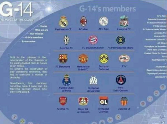 2006年,G14开始讨论从各自国内联赛低级别竞争中跳出,并于2007年密谋成立全新超级联赛,以彻底取代欧冠联赛。时任UEFA主席约翰松曾痛心疾首地表示,“G14把足球完全视为生意,他们试图实现‘胜者拿走一切’的目的。”