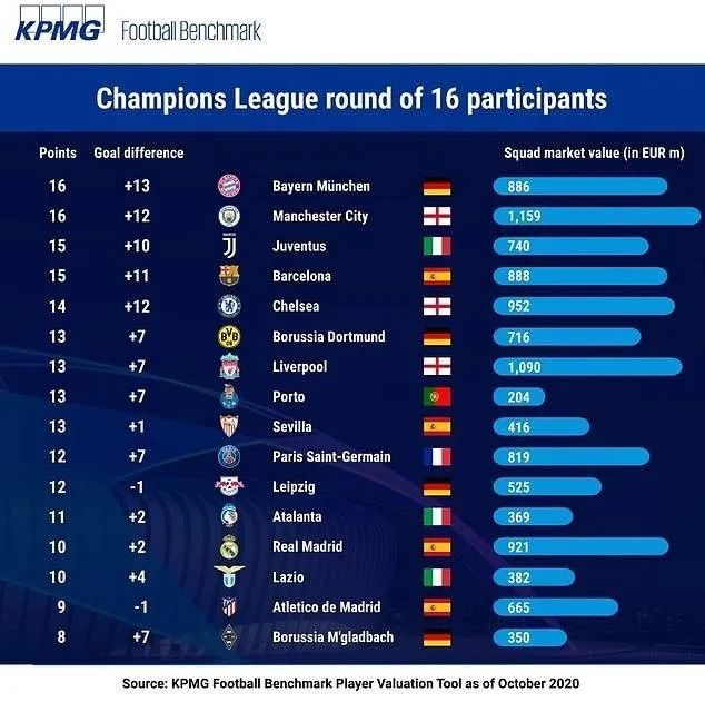 毕马威版本赛季欧冠16强球队身价