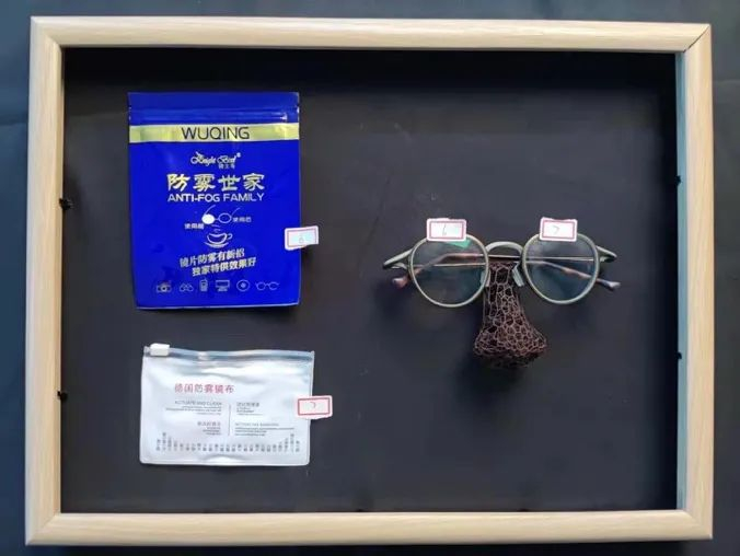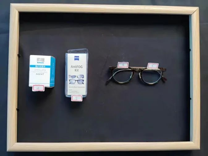 这7副镜架都进行了雾气测试(室内温度20度),除了8号防雾镜片雾气消散稍快,其他镜片雾气持续时间比较久。之后我们在每副镜片上进行标注序号,相对应的是解决方案。