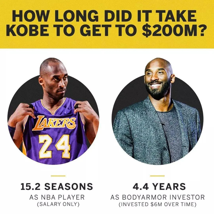从2013年跟腱断裂后,科比就明白自己的篮球职业生涯已所剩无几,于是他借助养伤之际开始学习投资经商之道。这一年,专门科比注册Kobe Inc公司来管理旗下商业事务,并开始从商业代言人往投资人转变。同年,科比斥资500万美元收购了运动功能饮料Body Armor品牌10%的股份,成为其第三大股东,这是科比的第一笔投资。