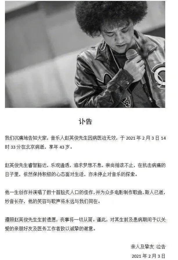 昨天2月3日,知名歌手赵英俊因为癌症,不幸去世。小编看到这一信息是昨天下午在朋友圈,第一感觉有点懵,怎么会这样?他才43岁。