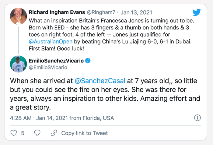为此,她经历过无数次手术,从小很多人就告诉她,你永远都不会成功,身体限制也不可能让你成为一名职业网球球员,但琼斯始终相信自己能做到。今年年初,虽然世界排名只有244位,但她心中抱着一个长远目标,“我不想止步于这个数字。”来到澳洲,在隔离的14天内,琼斯每天只有5个小时的训练时间,“我想对世界产生点影响,我不希望有多出名,但我想回馈一些东西给这个世界。为了做到这一点,我必须实现许多人都能引以为豪的目标,那是我最好的表达方式。”