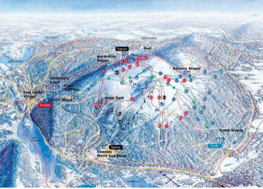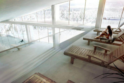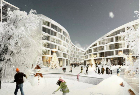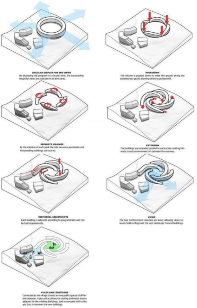 围绕着中央广场辐射排列着4幢独立的曲线屋顶建筑,这些建筑弯曲的屋顶直通向滑雪道,使滑雪者能够从屋顶上一路滑下去。四幢建筑还能为碗状的中央广场提供遮阳和避风的作用,以应对各种天气,同时又保留了周围的自然景观。