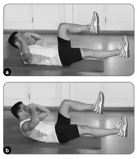 仰卧,一条腿呈90度抬起,另一条腿保持伸直膝关节。将双手放在头部的两侧,保持下巴远离胸部。将上背部和头部抬离地面,以便在整个训练组中,可以保持腹肌上面有恒定的力。进行10到15次的重复训练,接着换至对侧。