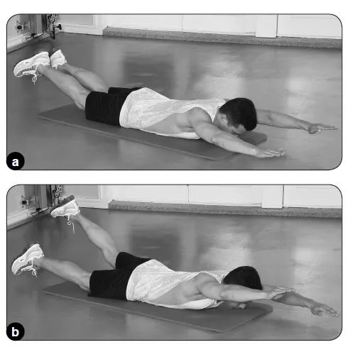 俯卧,收紧臀大肌,将左腿(包括股四头肌)抬离地面,抬得越高越好,同时收紧上背部肌肉,以抬起右臂。不要抬起头;保持眼睛看向地面。保持右臂和左腿高举并完全伸展,开始有控制地将右臂和左腿降低至地面以上的起始位置。完成规定次数。