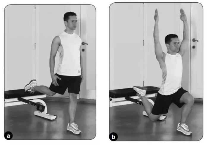 将重心保持在左脚脚跟和髋部上,下蹲或弓步向下直到后侧腿的膝关节下伸至快要接触到地面为止,同时将双臂举至肩部上方。髋部和脚跟发力,使身体向上至起始位置,在此过程中,将重心平衡在左腿上。完成规定次数,接着换至对侧。