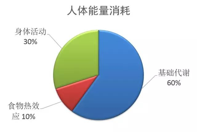 我们能量的摄入主要来自于食物,而能量消耗的途径就比较多了。首先是基础代谢,也就是我们维持基本的呼吸心跳等所需要的能量,占能量消耗的大约60%;