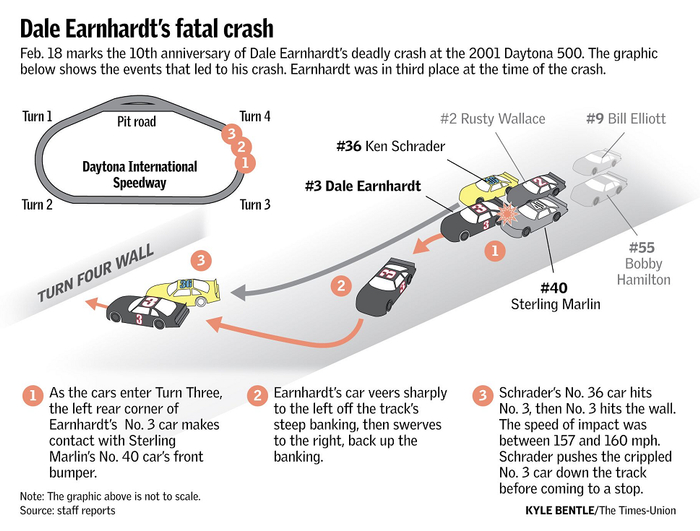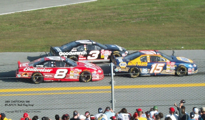 2001年Daytona 500大赛的最后一圈,Earnhardt位于第3,身前的两位车手都是Earnhardt个人车队(DEI)的车手(当时Earnhardt本人还在RCR车队),15号Michael Waltrip领跑,8号Dale Earnhardt Jr紧跟其后。手握七座杯赛冠军奖杯以及Daytona 500奖杯的Dale Earnhardt没有急于争夺领先,而是拼命守住身后的大部队,为自家车队的年轻人争取机会。