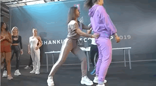 赛场上两位女性选手,互相猛烈地打对方的臀部,并使得对方向前迈进