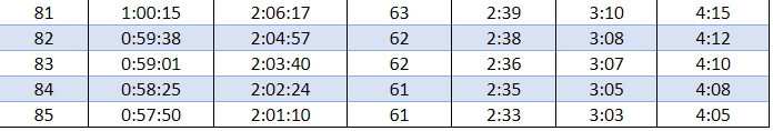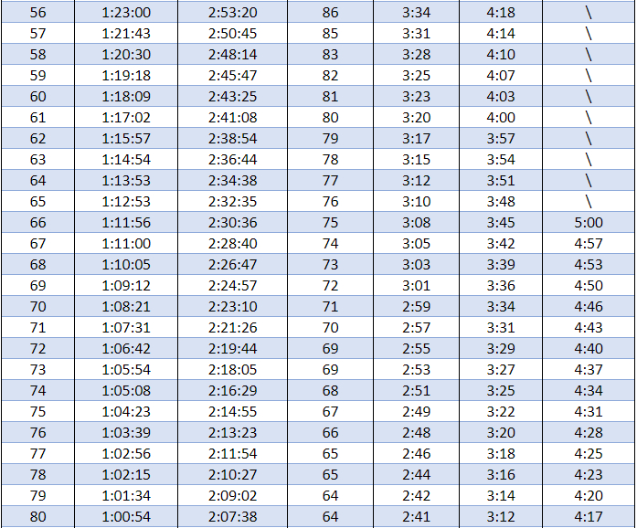 举例来说,你计划下一场马拉松破4,那么根据下表,如果这次间歇跑训练你准备跑5个1000米,那么每个1000米的配速只需要达到4:54配速就足够了,而不需要跑得更快。