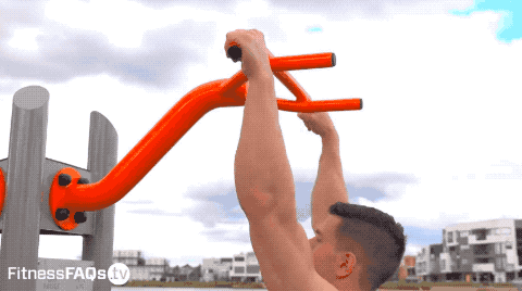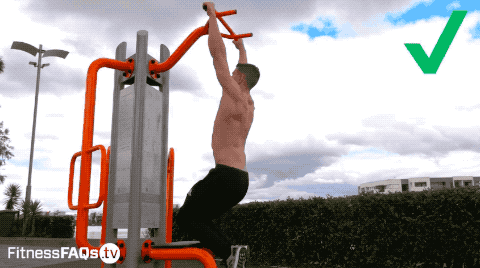 双手与肩同宽,向上至下巴过杠,向下至双臂伸直,全程身体无借力摇荡,并保持微微后倾。