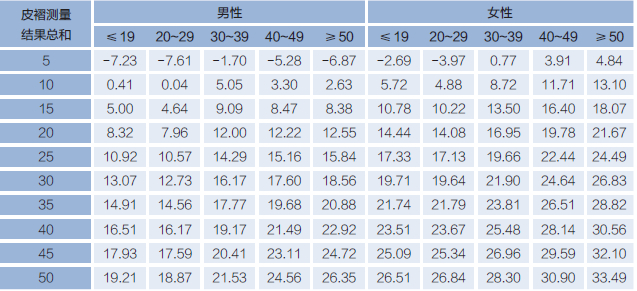 所有的皮褶测量都应在身体的右侧进行。在测量完4个部位之后,将4个测量结果相加,在德尔林-沃莫斯利体脂率计算表内找到相应的性别与年龄类别。例如,某40岁女性客户的皮褶测量结果总和为40,其体脂率是28.14%。