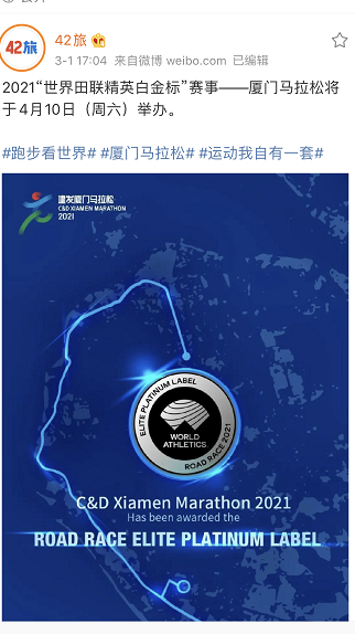 2月25日,世界田联官网宣布,厦门马拉松赛获得“精英白金标”赛事认证,得到跑友们的广泛关注。而仅仅在一周后,国内专业的跑步赛事报名和旅行行程预订平台42旅就爆料:2021厦门马拉松将在4月10日周六鸣枪开跑。时隔四个月,厦马将再度起航。
