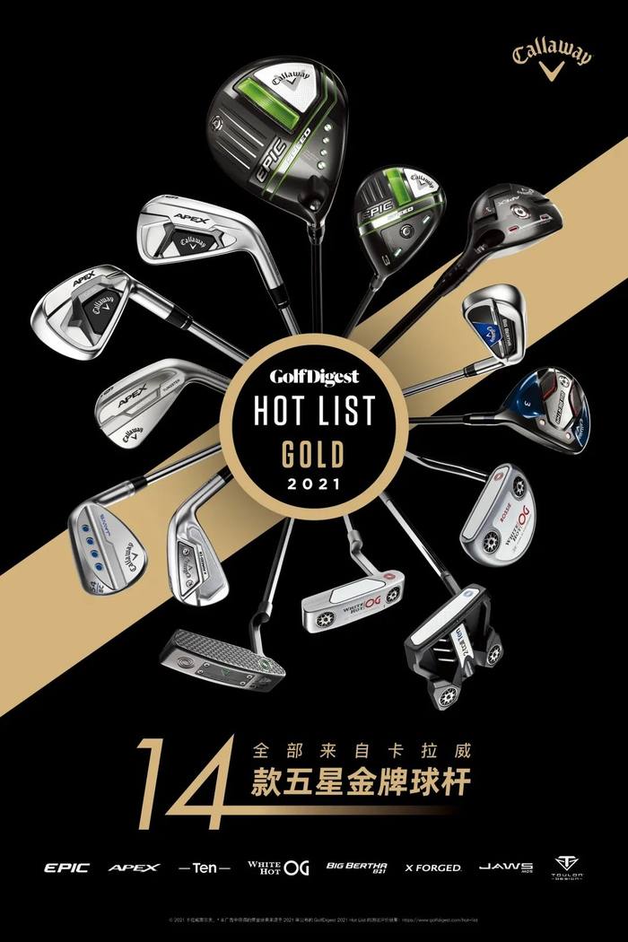 在最新的 Golf Digest 2021 Hot List 球具热力榜中,卡拉威 EPIC 系列发球木、球道木、APEX 系列铁木杆、铁杆和 ODYSSEY 推杆全新系列均斩获金奖,收获全五星好评。其中,Epic Max Ls 发球木更是在专业球具网站 MYGOLFSPY 的《2021最想拥有的发球木》评选中高居榜首!