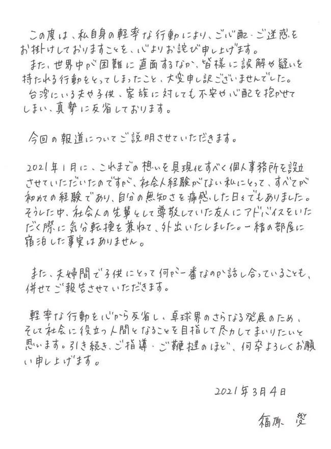 面对舆论批评和商家的解约风险,福原爱发布手写道歉信称,自己让在台湾的丈夫、小孩及家人感到不安及担心而深刻反省。但她仍坚称自己与该男子只是朋友关系,强调两人在酒店没有入住同一房间。而江宏杰也发表声明称,“对小爱的爱从认识第一天到现在都不曾改变,未来的路还很长, 我们彼此的情感都不会因此消失”,并斥责福原爱出轨报道为不实八卦:“真心不希望这些不实八卦伤害了我们的至亲。”