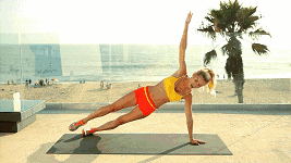 左臂伸直,左手侧撑在瑜伽垫上,右臂向上伸直抬高,双腿并拢伸直,且左脚撑住地面,右脚悬空于地面,保持背部挺直,收紧腹部,然后将右腿绷直并慢慢向前抬高,再收回。如此反复进行,完成后换另一侧继续。