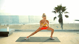 双脚并拢站直,双臂曲肘,双手放于身前,然后将右脚向右侧为迈出一步,使双脚尽量分开,保持背部挺直,收紧腹部,上半身向前压低;然后使左腿屈膝半蹲,并将身体的重心放于左脚上,同时右腿伸直;然后再慢慢起身,将右腿屈膝半蹲,并使身体重心放在右脚上,同时左腿伸直。如此反复进行,注意,在动作进行过程中,要始终保持背部挺直,且上半身向前压低的状态。