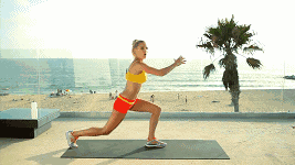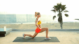 双脚并拢站直,双手超要,保持上半身挺直,收紧腹部,然后将右脚向前迈出一大步,双腿屈膝向下深蹲,并使右腿呈90度状态,然后再慢慢起身。如此反复进行,完成后换另一侧继续。