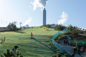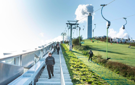 发电厂屋顶斜坡有88米高,设置了3条滑雪道,总长度超过1500米,还设了180米速滑挑战,最陡的地方足有45°。滑雪者可以沿着工厂的烟囱,乘电梯而上,从地面到达斜坡屋面的顶端。