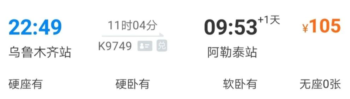目前直通阿勒泰的火车是:乌鲁木齐-阿勒泰,每天只有一趟,晚上10:49出发,第二天早上9:53到达阿勒泰。