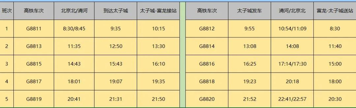 从北京出发乘坐高铁抵达太子城站,出站后可乘坐云顶乐园免费接驳大巴,一小时左右便可到达云顶雪场(高铁往返雪场接驳大巴时刻表与高铁时刻表同步)。