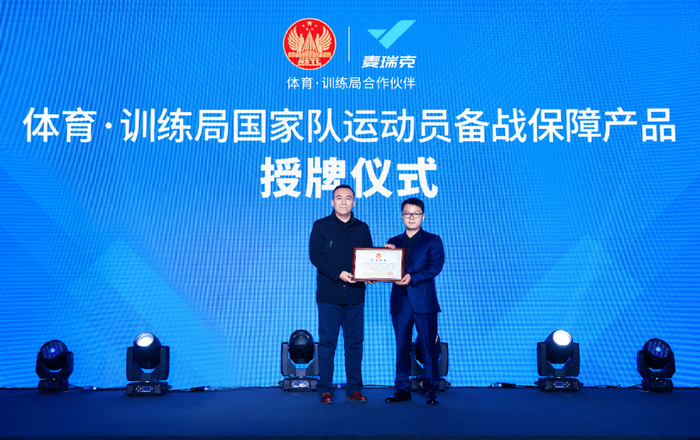 在此次发布会上,国家体育总局训练局副局长孙晓晔为麦瑞克颁发“体育·训练局合作伙伴”证书,举行授牌仪式,同时,国家体育总局训练局事业发展处处长陆煜授予麦瑞克“国家队运动员备战保障产品”。此外,国家体育总局训练局体能康复中心主任张璐与罗卫波共同为“麦瑞克-国家体育总局训练局健康运动联合研发中心”进行揭牌,并宣布,麦瑞克产品将正式入驻训练局体能康复中心,并推出联名产品。