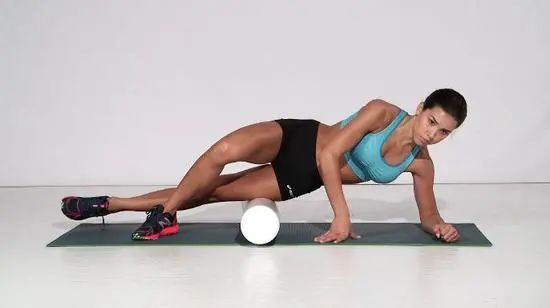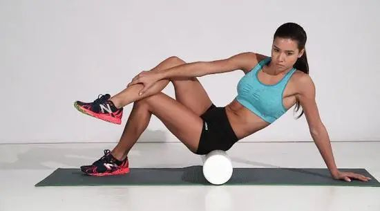 坐在泡沫轴上面,左膝盖弯曲,左脚放在地面,右脚踝放在左膝之上。身体向左侧倾斜,在左侧臀部范围内来回滚动泡沫轴。