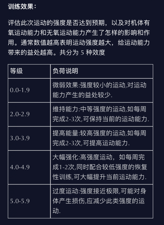 而与训练负荷相对应的另外一个重要指标就是训练效果(Training Effect),从字面上看,就是指训练所取得效果。