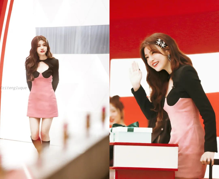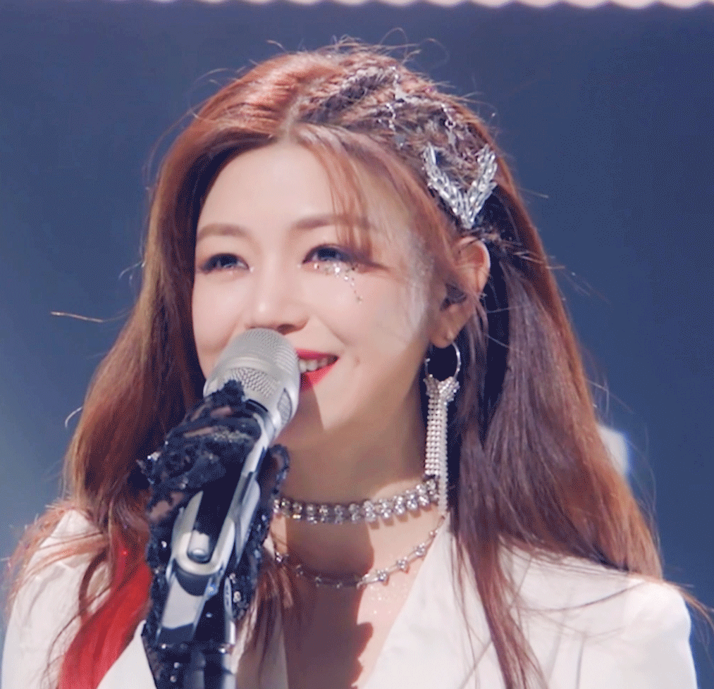 微卷散发的装扮,肉乎乎的脸蛋,亮晶晶的眼,这模样简直就是团内的“甜妹担当”。