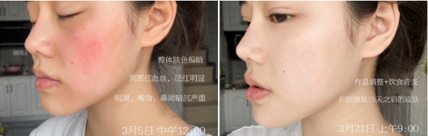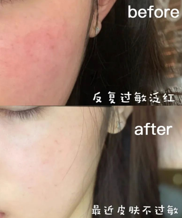 而另外一个敏感肌的朋友,以前有高原红,现在,双颊肉眼可见的泛红缓解了,就连之前的干燥起皮的情况,都缓解了很多。