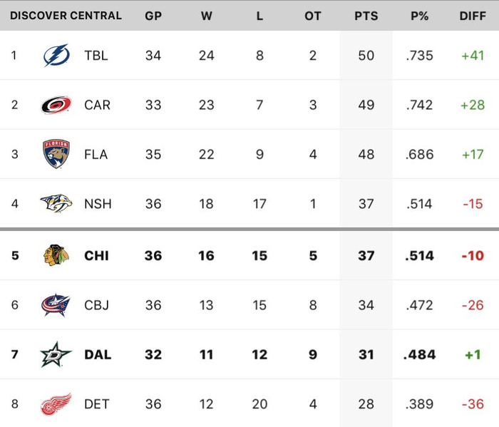 中区前三的队伍依旧积分交替上升,卡罗莱纳飓风表现强势,后卫汉密尔顿连续13场得分,不断威胁着坦帕湾闪电分区头名的位置。纳什维尔掠夺者异军突起,取得5连胜,排名跃升至第四,达拉斯星队由于疫情少赛4场,除去底特律红翼,其他4支球队将争夺最后一个季后赛席位。