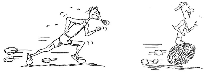 因此,要想减少着地时地面冲击力,我们必须在着地时保持膝关节处于弯曲状态,并通过着地后膝关节积极下压,依靠肌肉而非骨骼来缓冲地面冲击力,那么怎样才能让膝关节处于弯曲状态呢?适当缩小步幅,让着地点更加靠近重心。这就好比,我们从高处跳下,如果着地瞬间你的下肢关节都是伸直的,你当然会受到很大地面冲击力,甚至引发骨折,但如果你落地时膝关节保持弯曲并积极屈膝屈髋屈踝,就可以有效缓冲地面冲击力,将巨大的冲击力消散于积极下压动作。