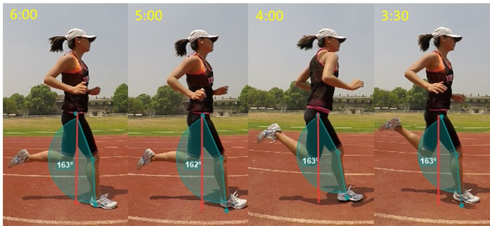 这也说明着地时脚的位置没有因为速度变化而改变。合理的着地位置为:着地点在重心微靠前一点,既不是在完全重心正下方,但也不会距离重心太远,膝关节在着地时保持弯曲非常必要。这样一方面可以分解膝关节受到的地面反作用力,一方面可以通过积极下压缓冲,进一步减少膝关节受到的作用力并为蹬伸储备弹性势能。